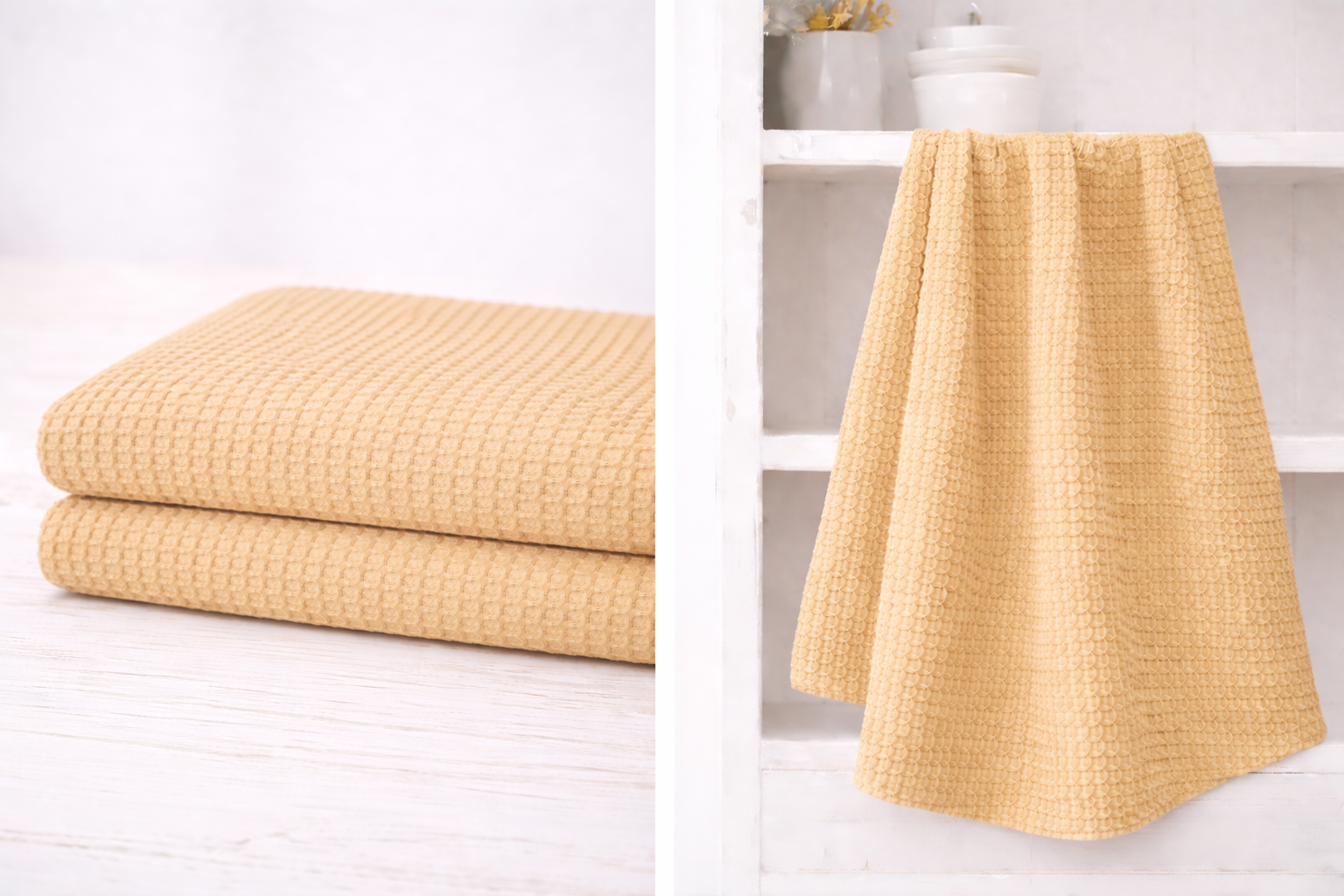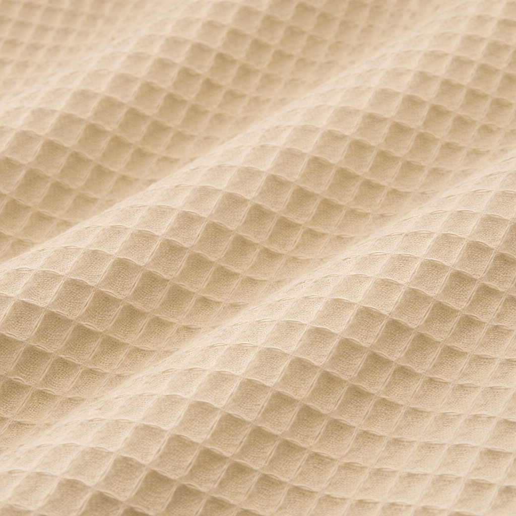 La tela waffle tiene una superficie con textura tipo honeycomb o relieve cuadriculado que atrae la mirada y aporta tacto interesante. Es suave, transpirable y absorbente gracias a su estructura tridimensional.